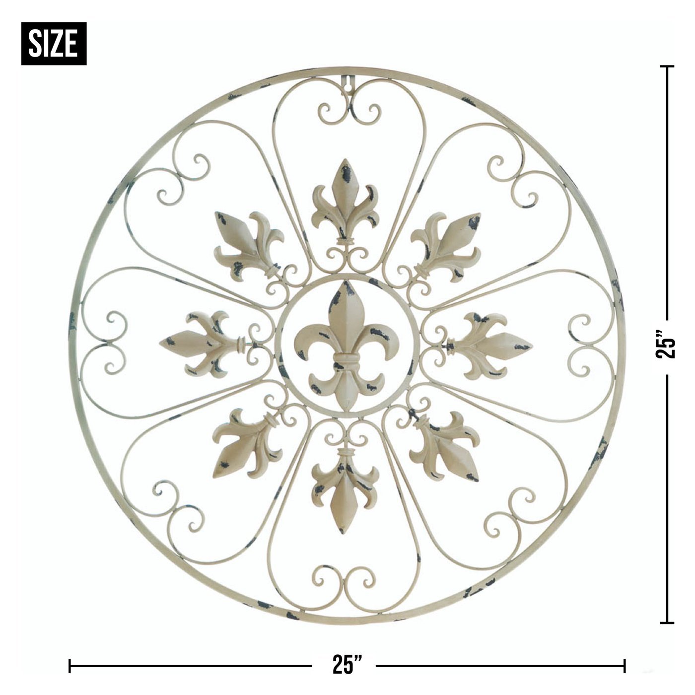 This cool wall accent measures more than two feet in circumference, and will have a big impact on the style of your room. It features French inspired fleur- de-lis symbols and heart-shaped scrolls that will bring an abundance of style to your bare wall.