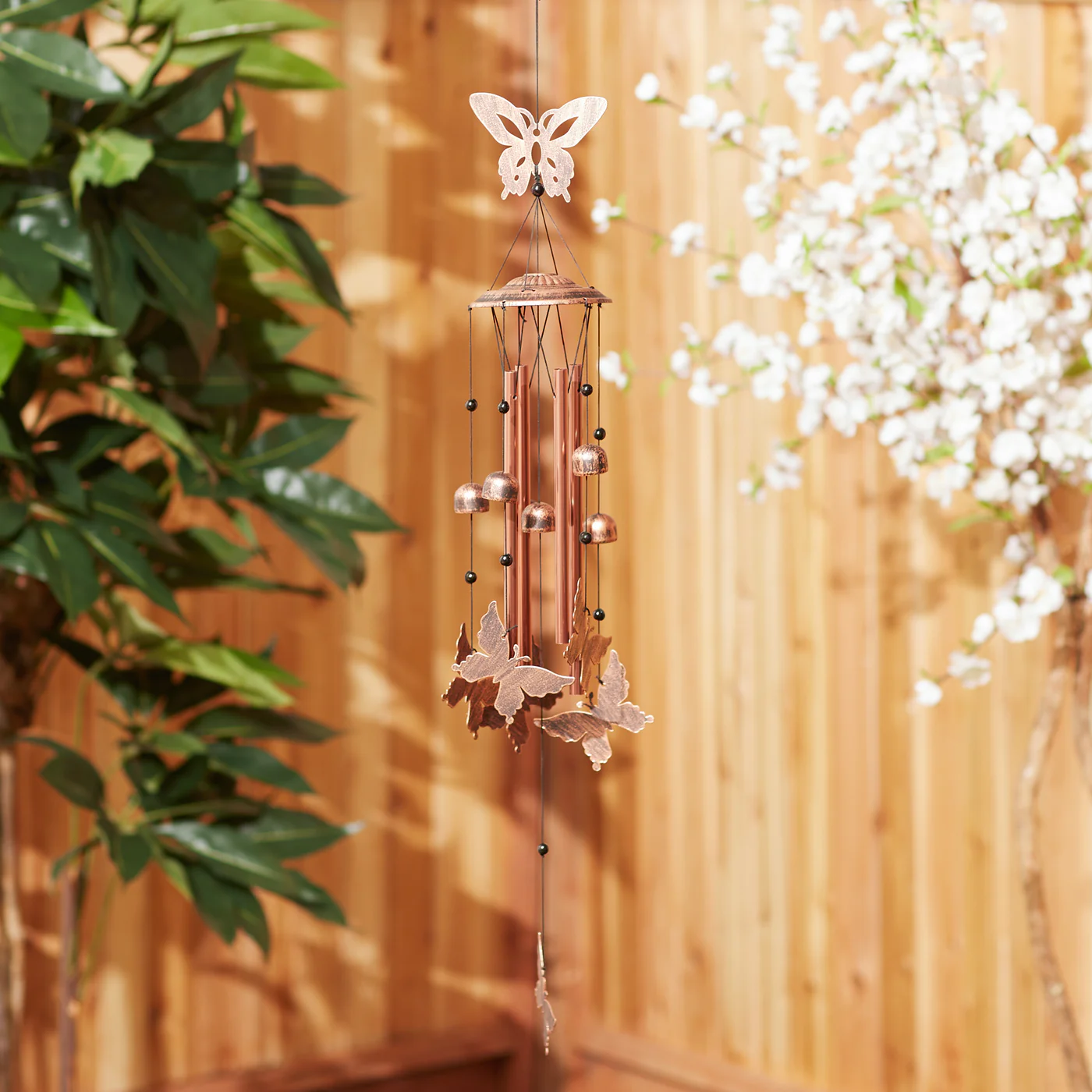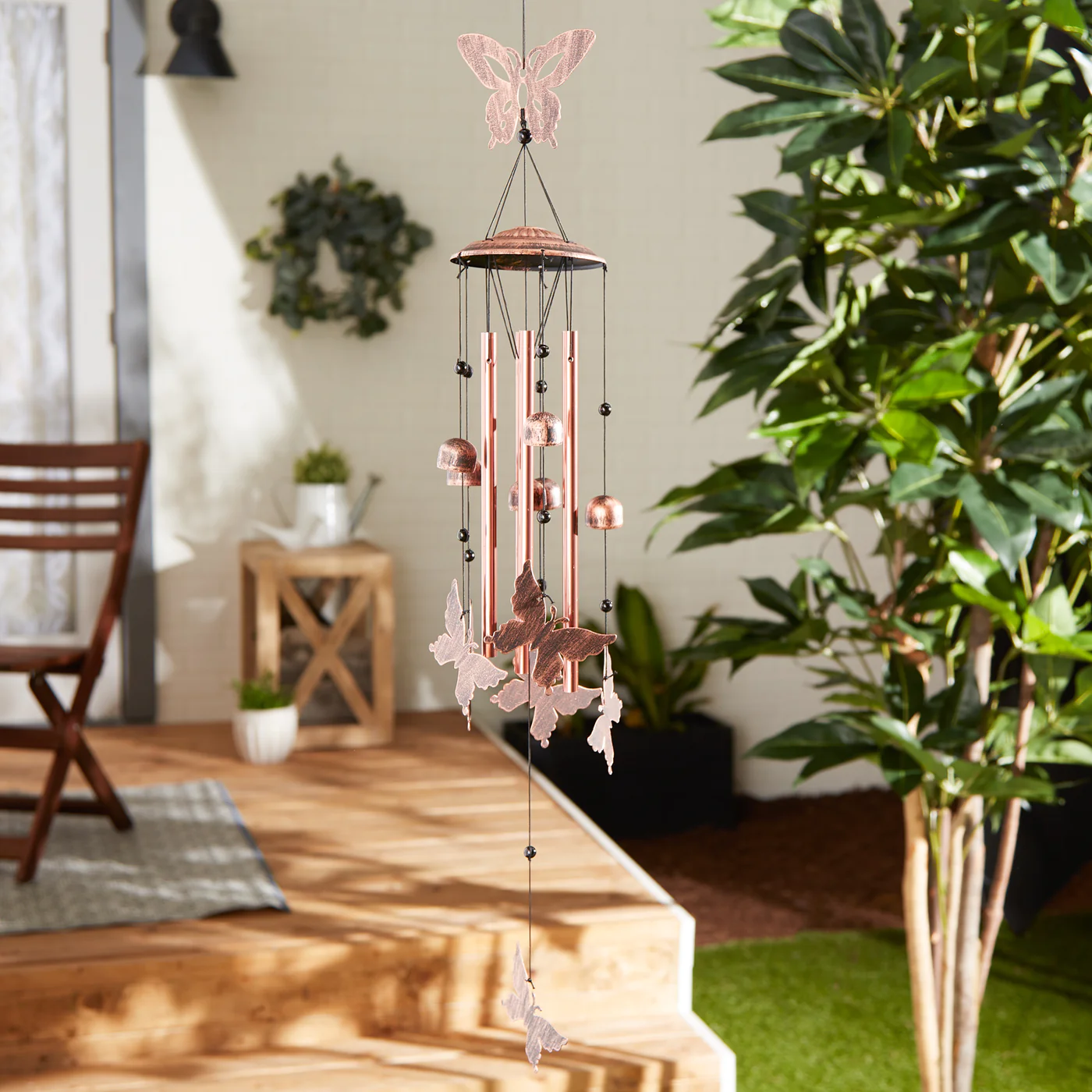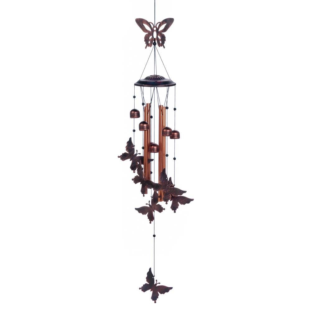 A flock of butterflies to fill your days and evenings with sweet sound! This beautiful metal wind chime features a singular butterfly cutout on top, long chimes below along with small bells, and a group of butterflies that will twirl in the breeze.