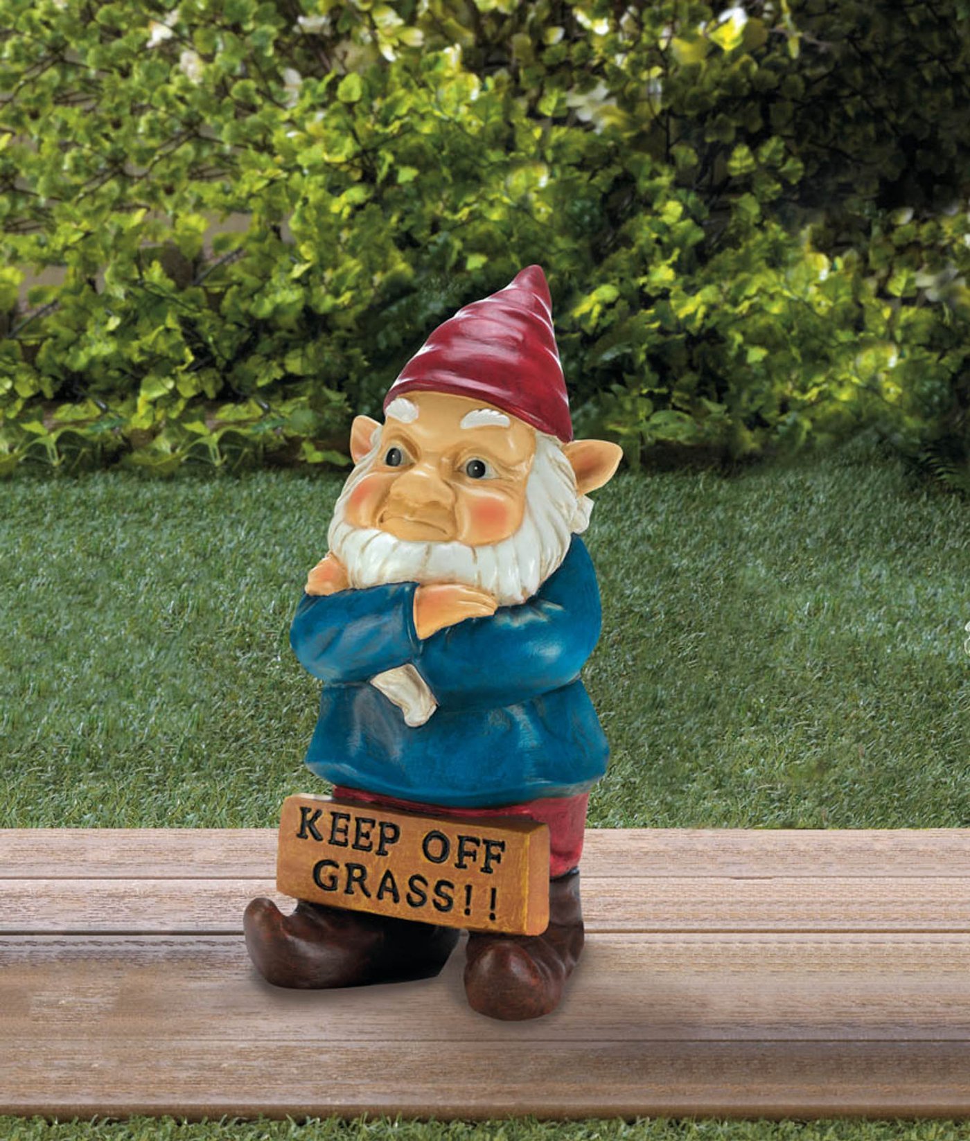 Don't cross this gnome! He's got a grumpy look and a sign that reads 'Keep Off Grass!!' which makes him a great addition to your high-traffic outdoor areas.
