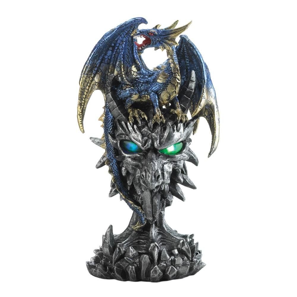 Ready to go battle, this dragon, perched atop an intricate silver monument, has fiery red eyes and sharp jagged teeth . This statue features metallic blue and gold accents with a light up LED's eyes making it a statement piece in any room.