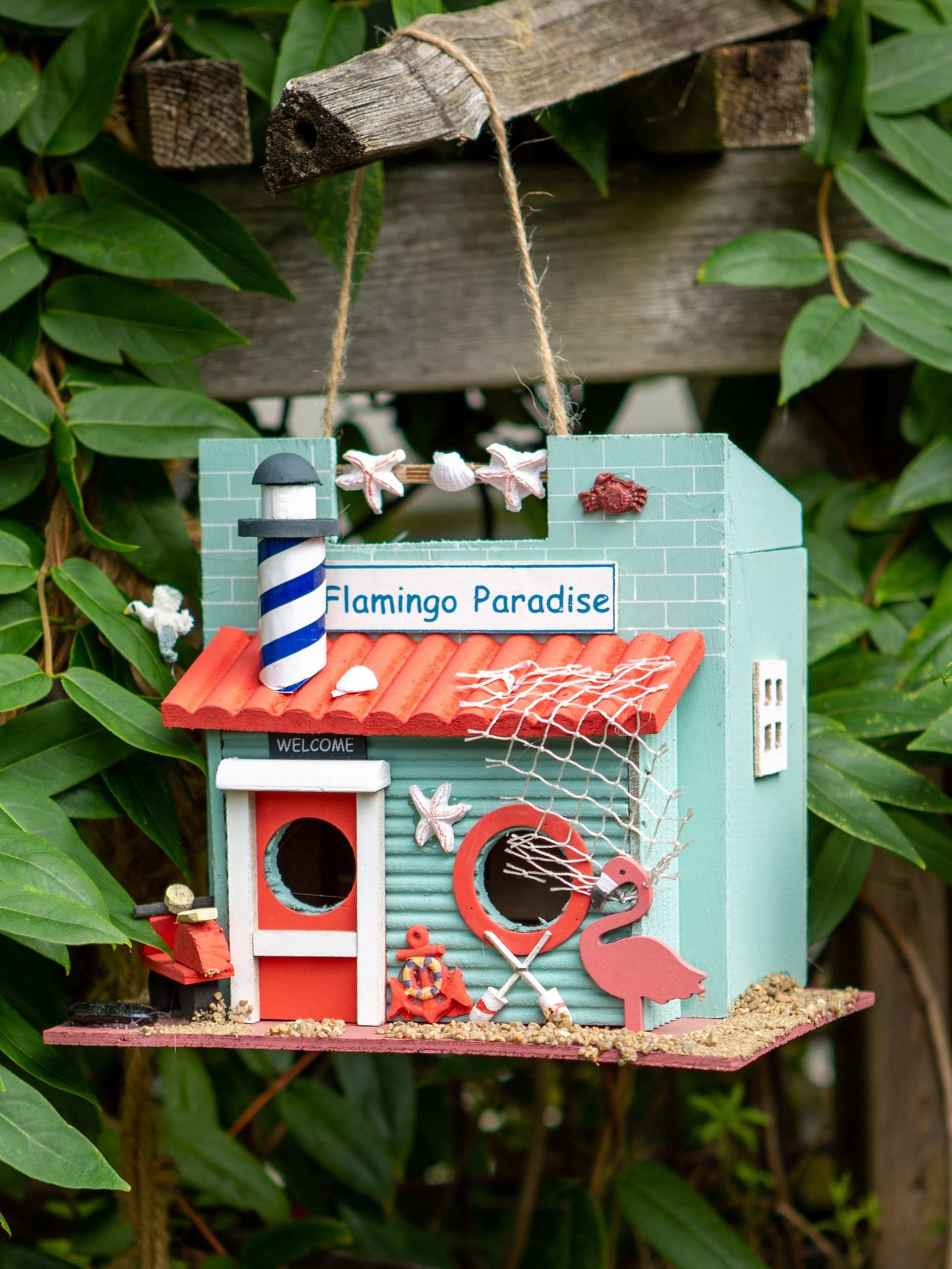 A fun flamingo hangout by the sea, this novelty birdhouse welcomes your fine feathered friends. Seafoam blue, navy and bright coral hues make this birdhouse a cute conversation piece.