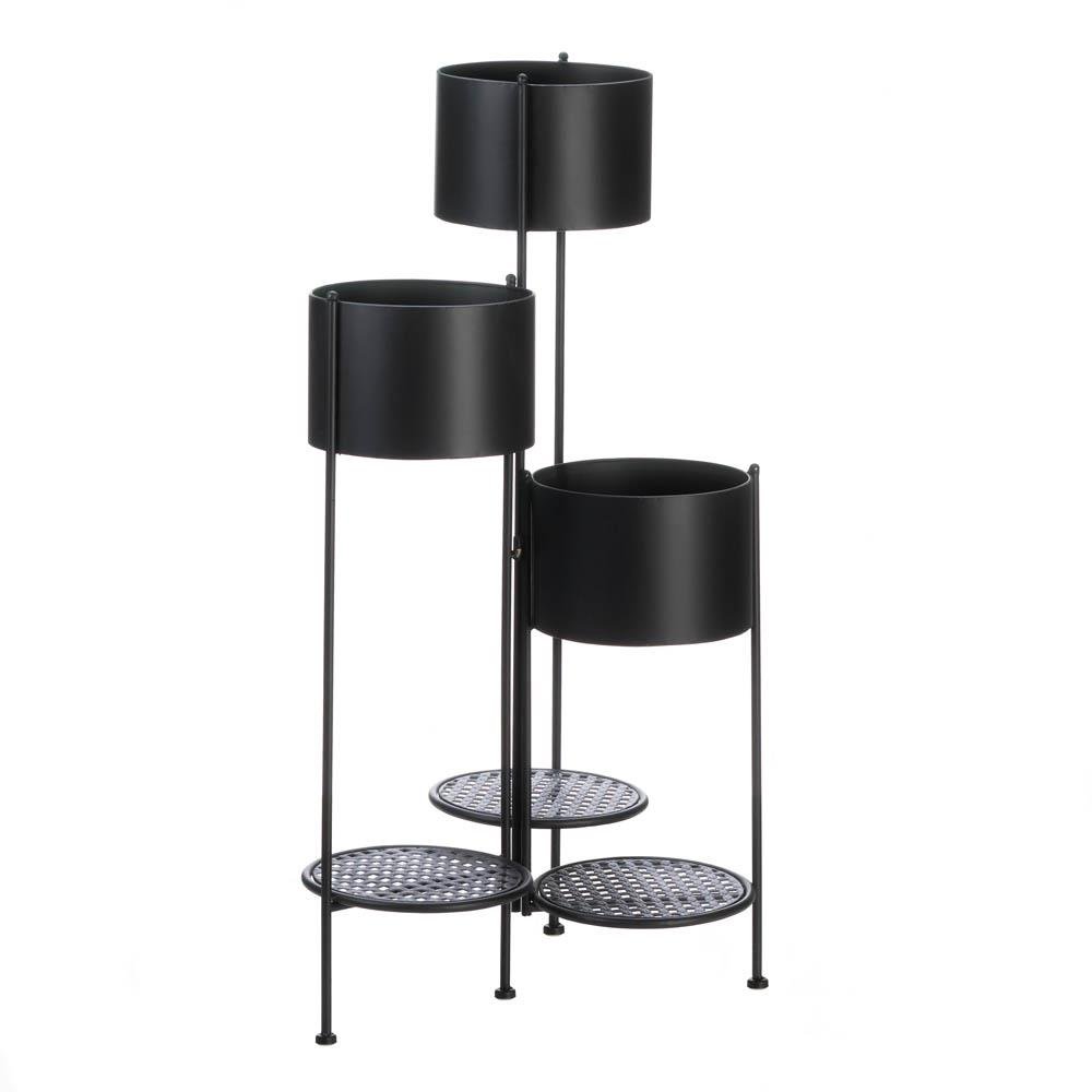 Showcase your plants with this contemporary matte black finish 3-tier plant stand. The graceful stair step arrangement can display 3 large plants in a minimum amount of space. Additionally, 3 smaller plants can be placed on the bottom metal mesh shelves.