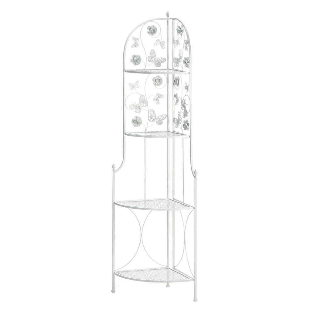 This corner rack features four latticework shelves to hold your favorite potted plants or trinkets of any kind. Butterflies and flowers embellish the white iron scrollwork to create a friendly garden atmosphere indoors or out. Place in a sunroom, on a patio, or deck to add greenery to your space. This corner rack features four latticework shelves to hold your favorite potted plants or trinkets