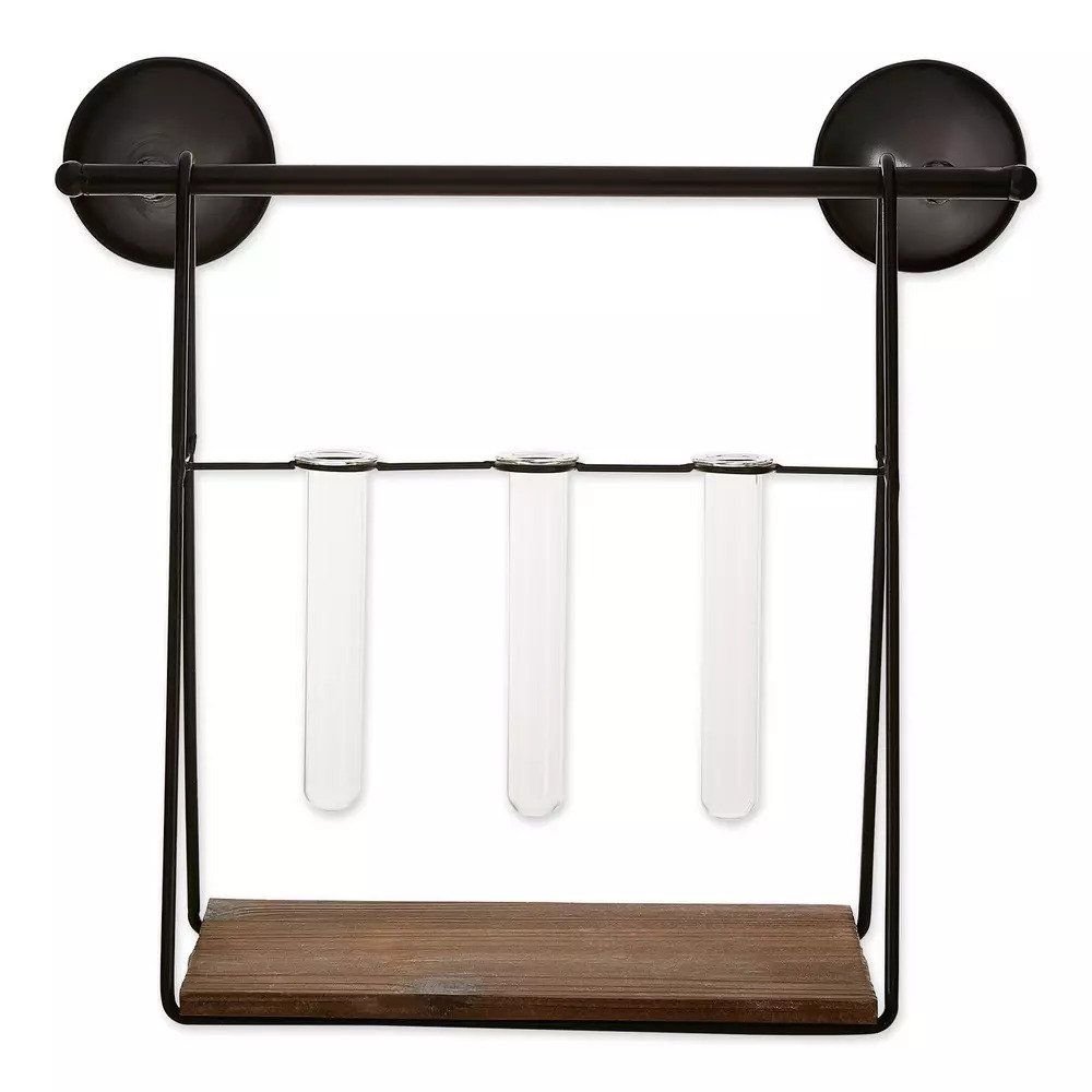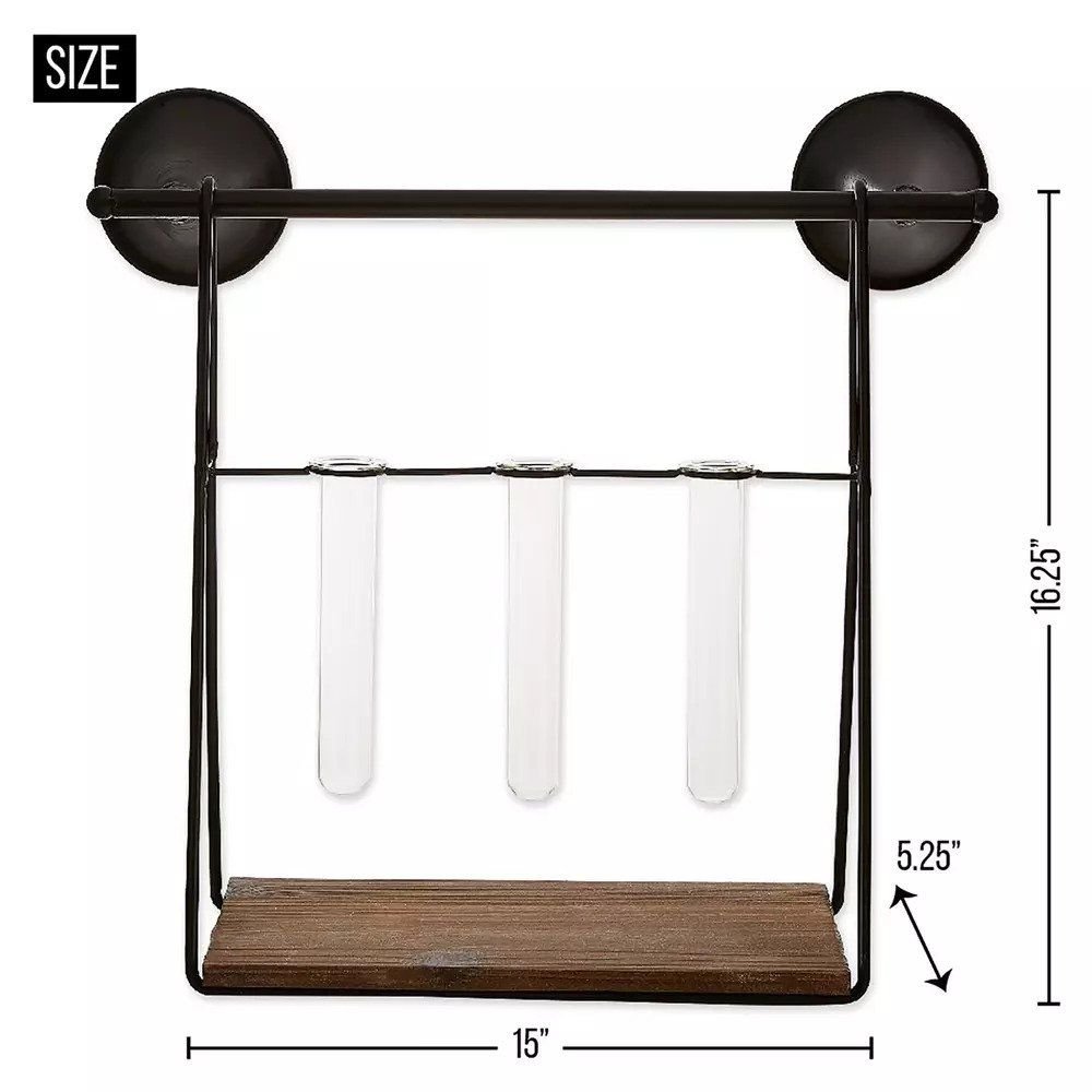 Featuring a black iron frame with a wooden shelf and 3 small vases, this is the perfect plant propagation paraphernalia! Fill with the plants or décor of your choice to create a stunning wall mounted piece.