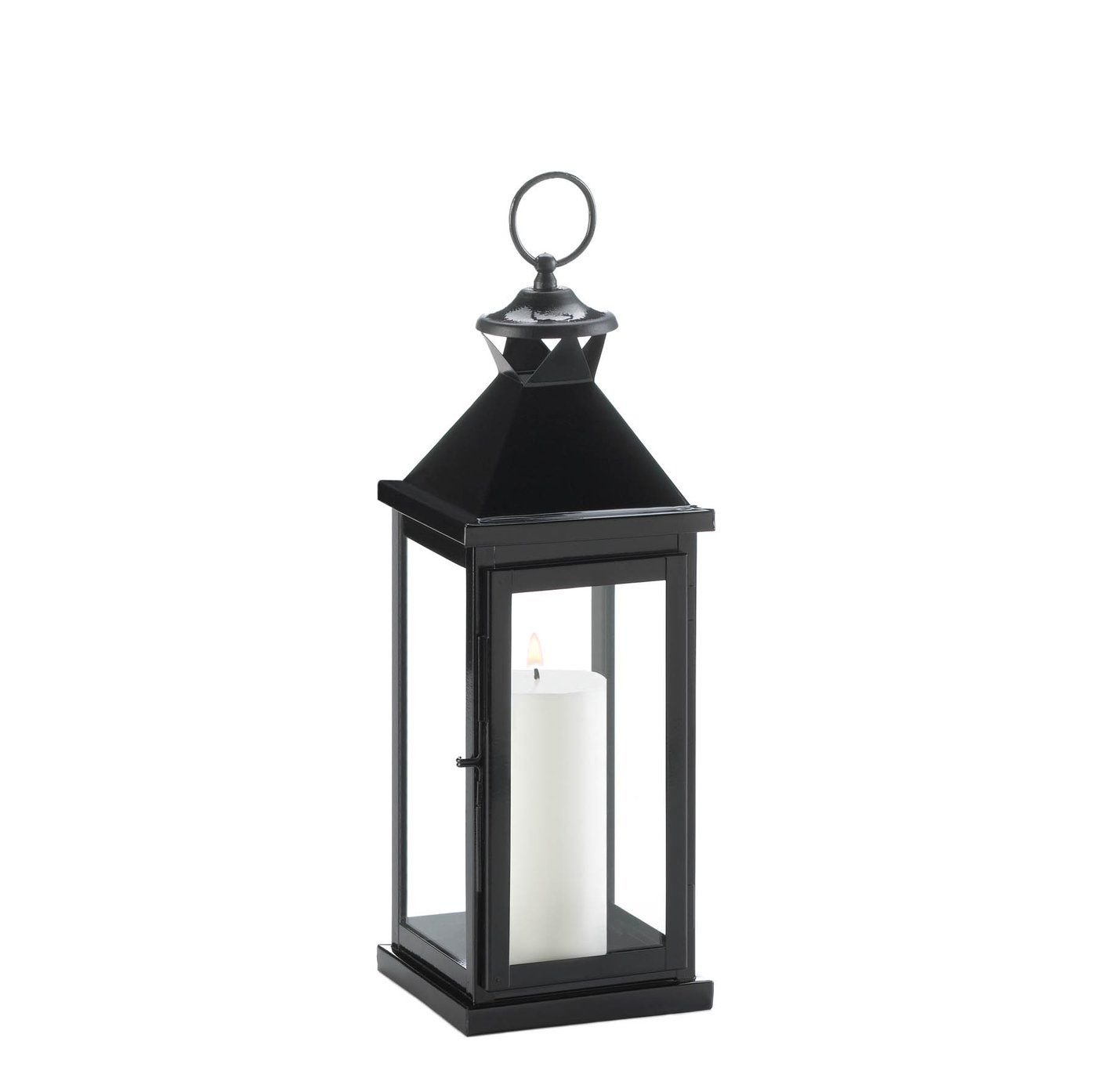 Create a modern candlelight display with this large metal and glass candle lantern. The lantern features a traditional frame with a square base, glass window panes and a contemporary galvanized metal top. Finished with a metal ring for easy hanging, this decorative metal lantern will make your space look cozy and chic. Place on an end table, coffee table, or a cabinet, mix with other chic decor for a polished finish. Add a flameless candle for a gentle, warm glow.