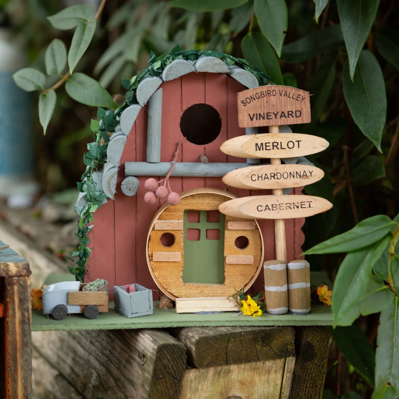 Songbird Valley Vineyard is a rustic hotspot for birds of good taste and is adored with grape wines, barrels, and slatted roof. Inspired by a vintage winery, this birdhouse offers merlot, chardonnay, and cabernet as options for its feathered guests