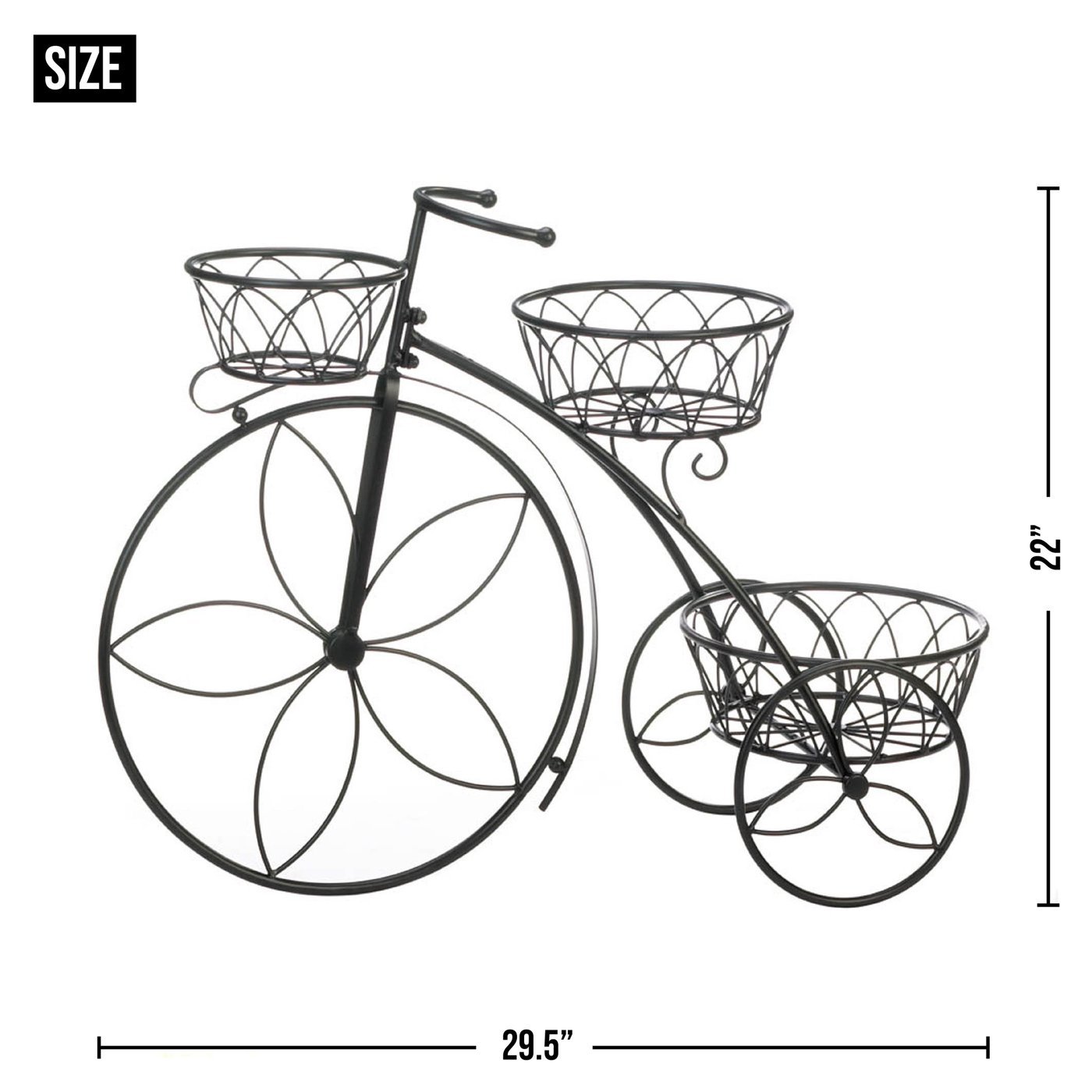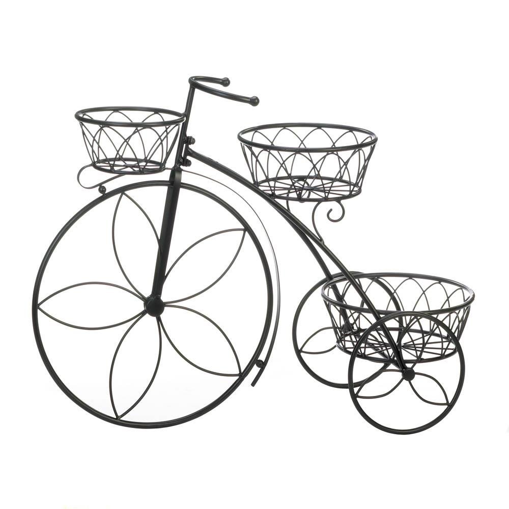 Holds three plants and can be displayed in your flower garden, on a patio, deck, or sunroom. This charming bicycle plant stand is perfect to show off your favorite potted plants.