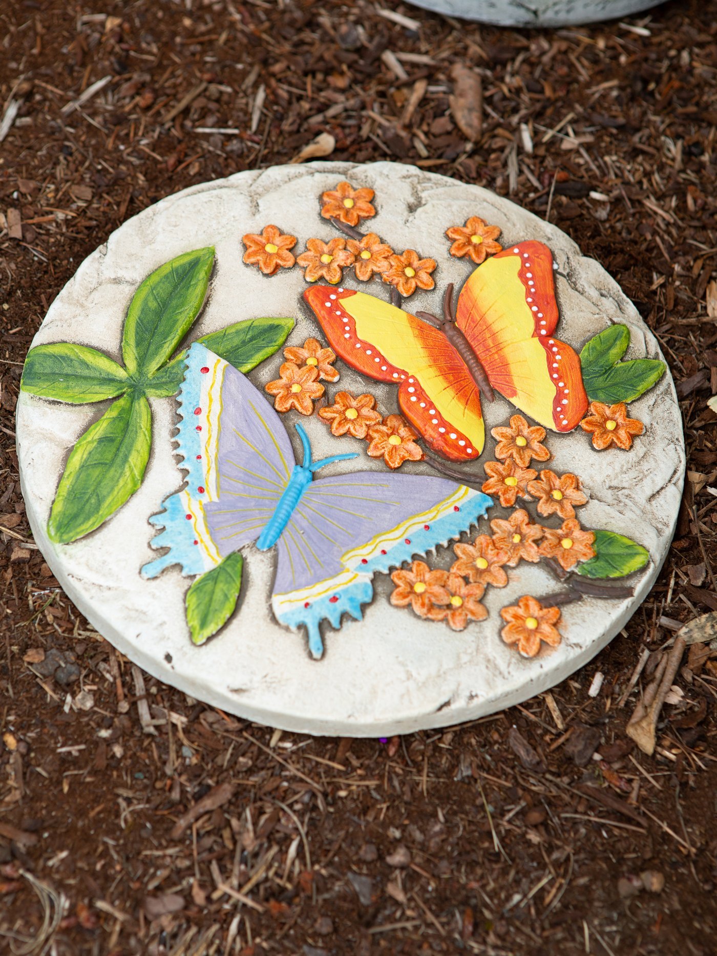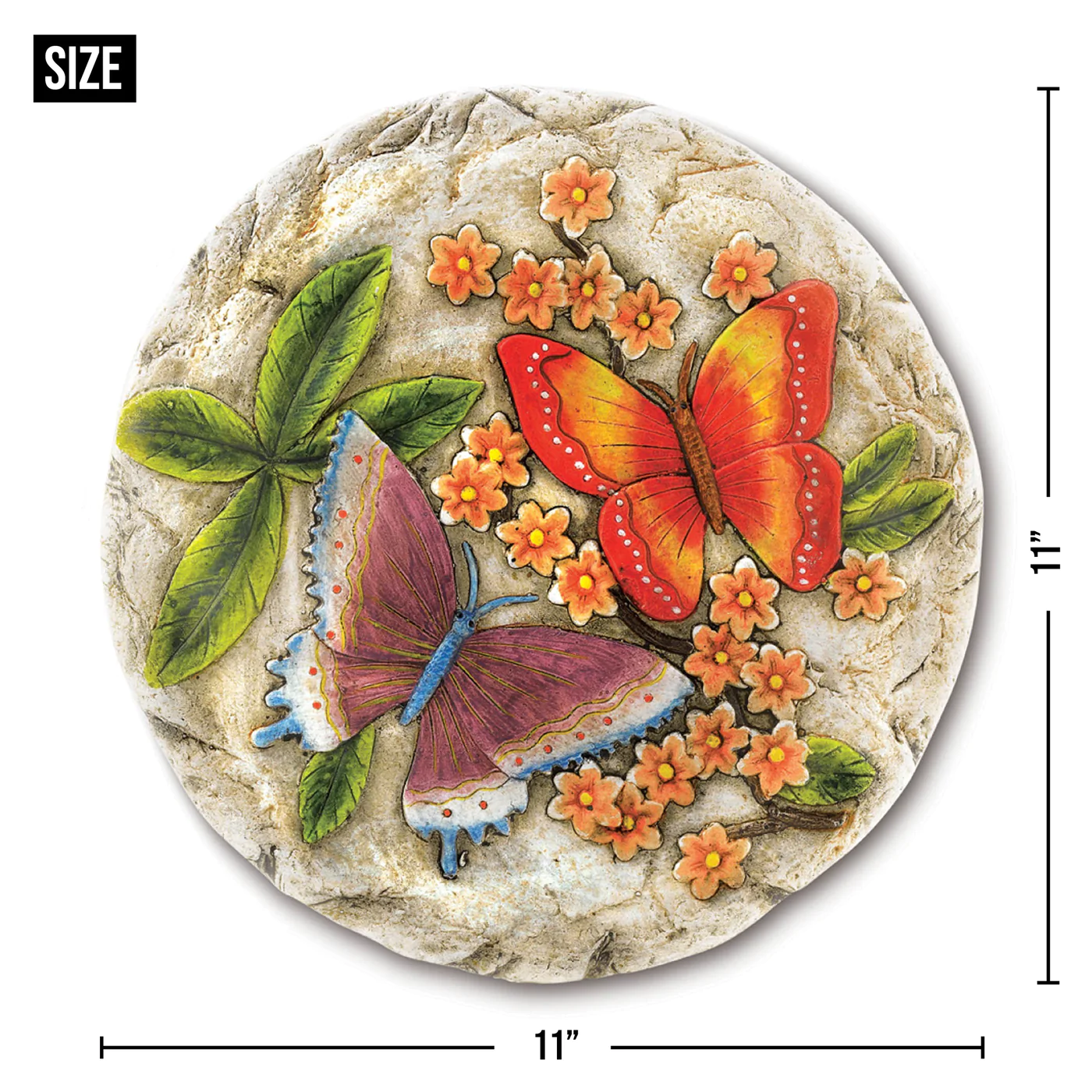 A pair of vivid butterflies frolics amongst lush foliage, enlivening a bas-relief stepping stone with glowing colors and romantic sentiment. Sure to be the crowning jewel of your garden!