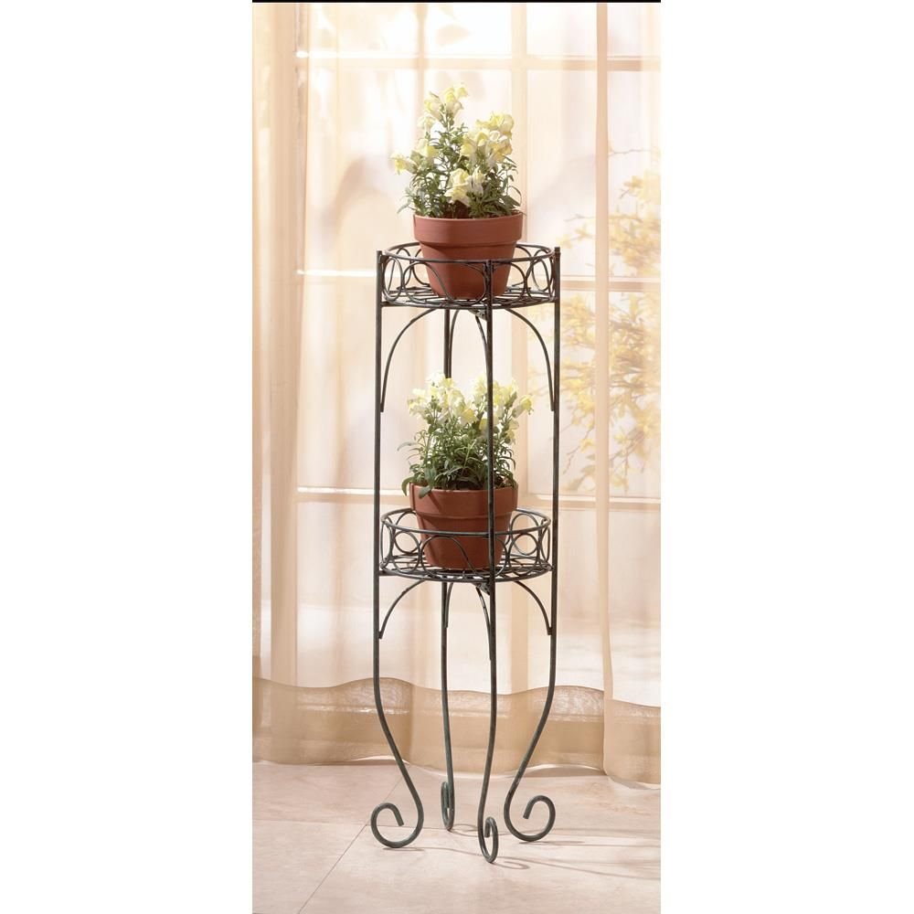 Lacy scrolls in a verdigris-style finish comprise this two-tier plant stand. A graceful addition for indoors or out with shelves securely holding two of your favorite plants!