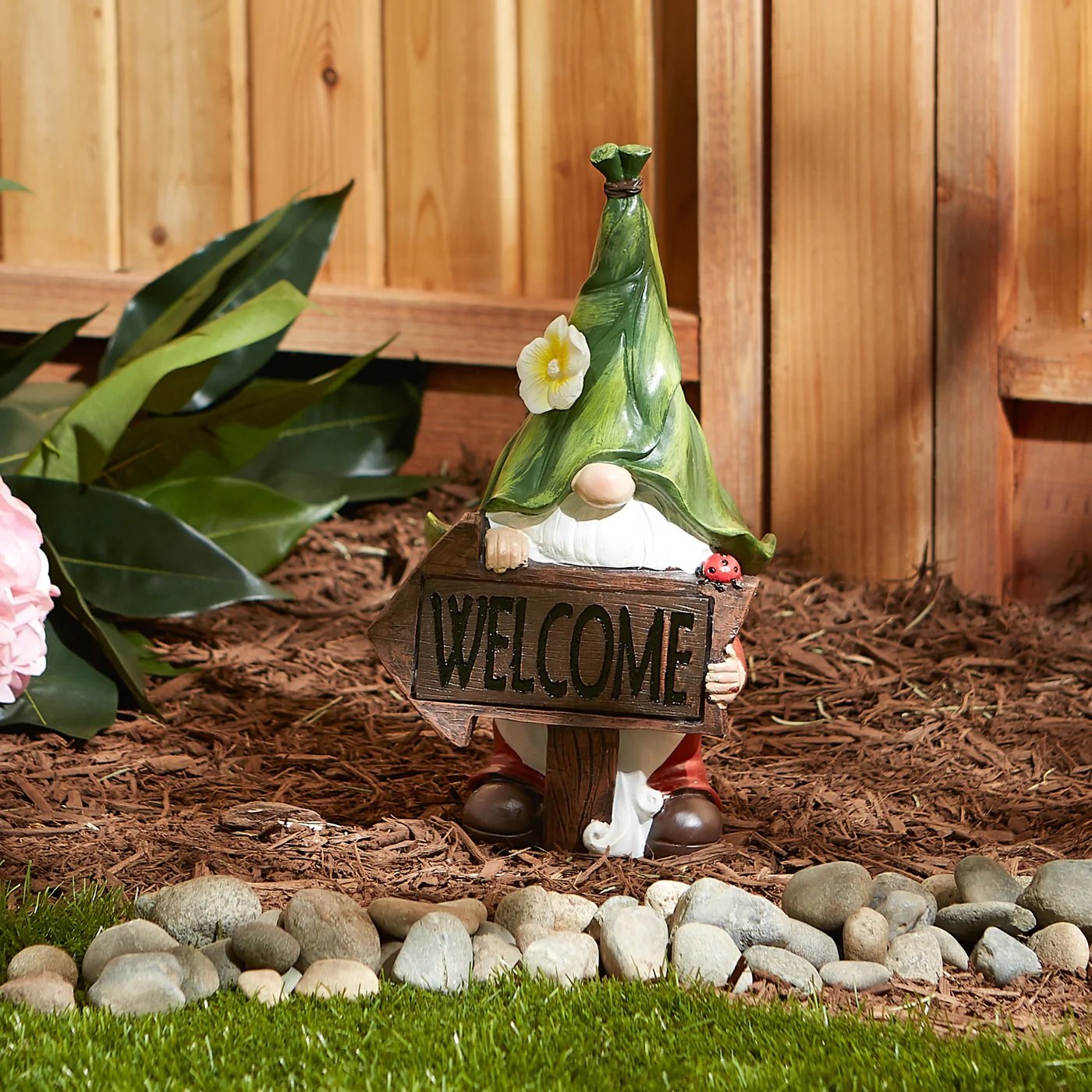 Make your garden guests feel welcome morning and evening with this adorable gnome statue and welcome sign. His long beard curls around a welcome sign that lights up in the evening with the help of the solar panel on the hidden on back of his hat.