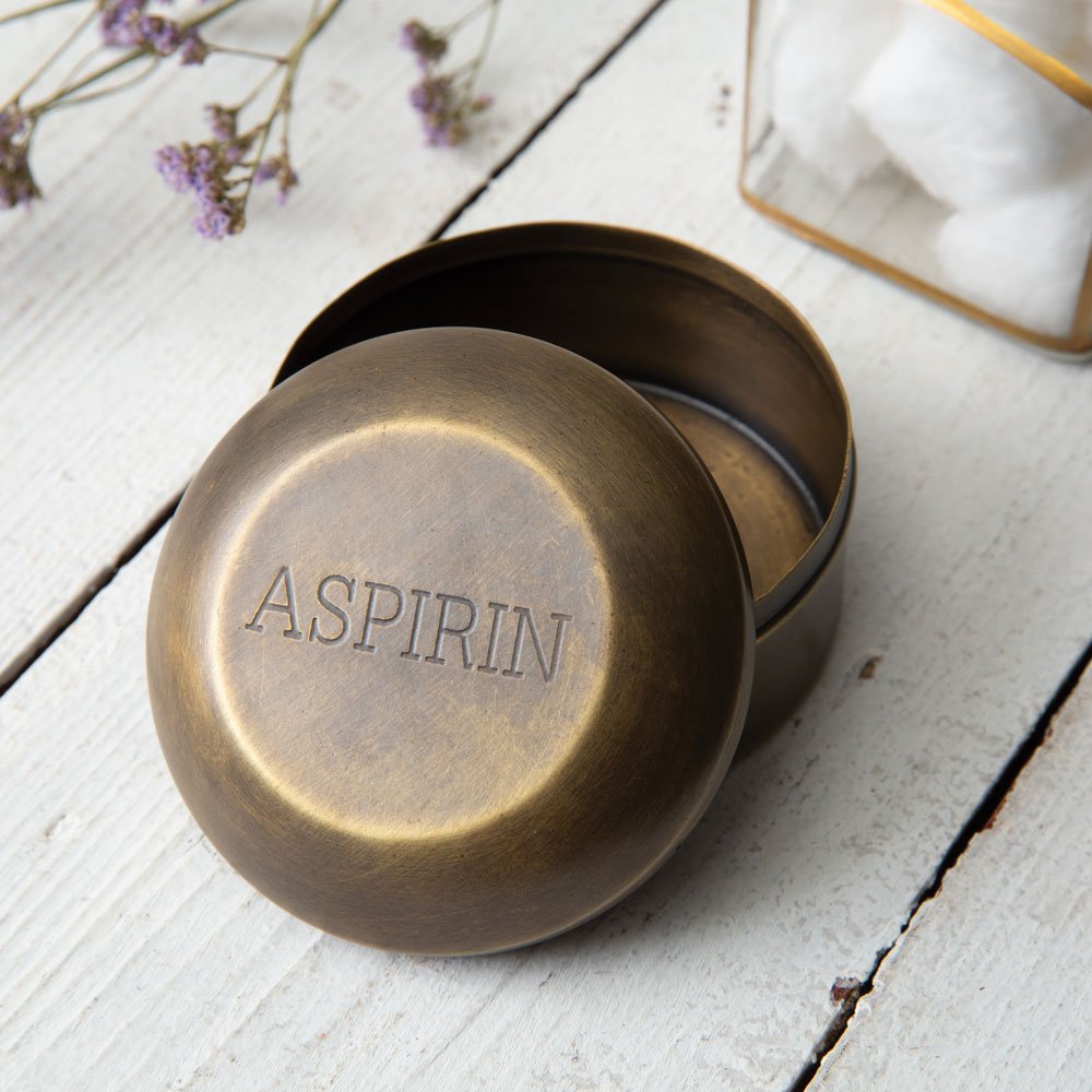 Place this antique brass pill box on your counter for a vintage look and place small trinkets inside. This box is made of metal and reads aspirin on its top. The item is not intended to place actual medication inside.