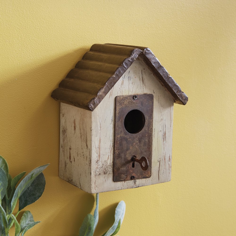 Add a little whimsy to your outdoor space with our Lock and Key Birdhouse. Inspired by antique doorknob hardware and skeleton keys, this birdhouse is a unique home for your feathery friends. Item is made of solid mango wood and features a hinged door for easy cleanout.
